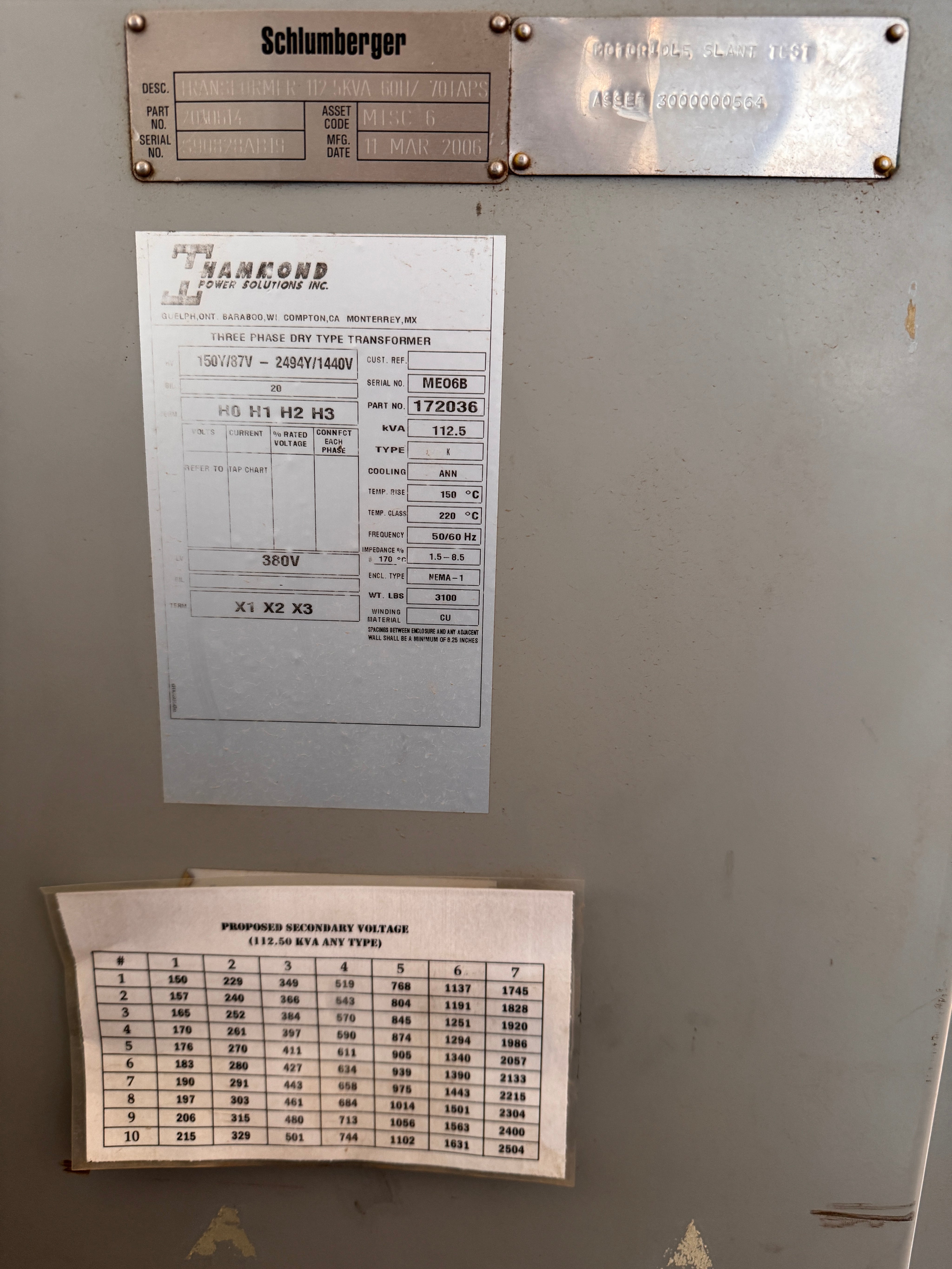 112.5 KVA 2494Y/1440V to 380V Isolation Transformer