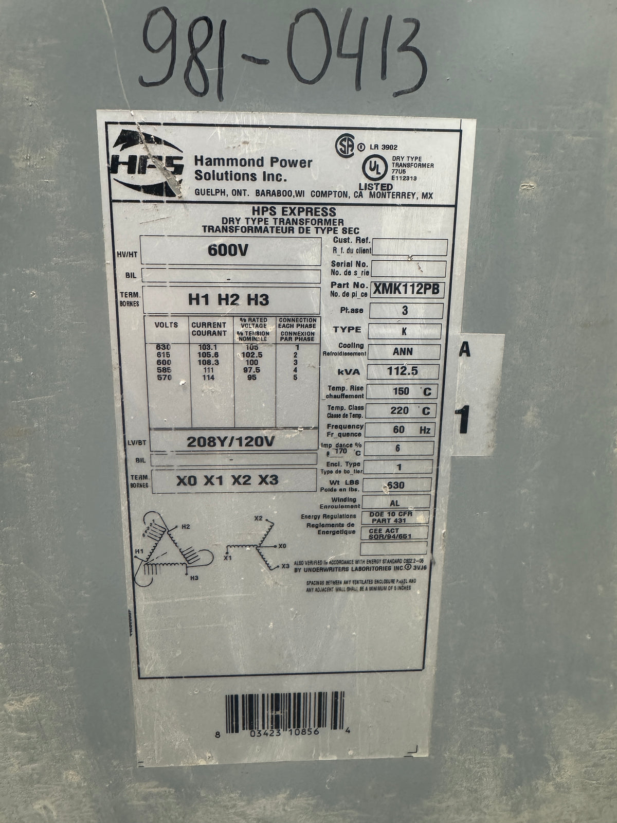 112.5 KVA 600V to 208Y/120V Isolation Transformer