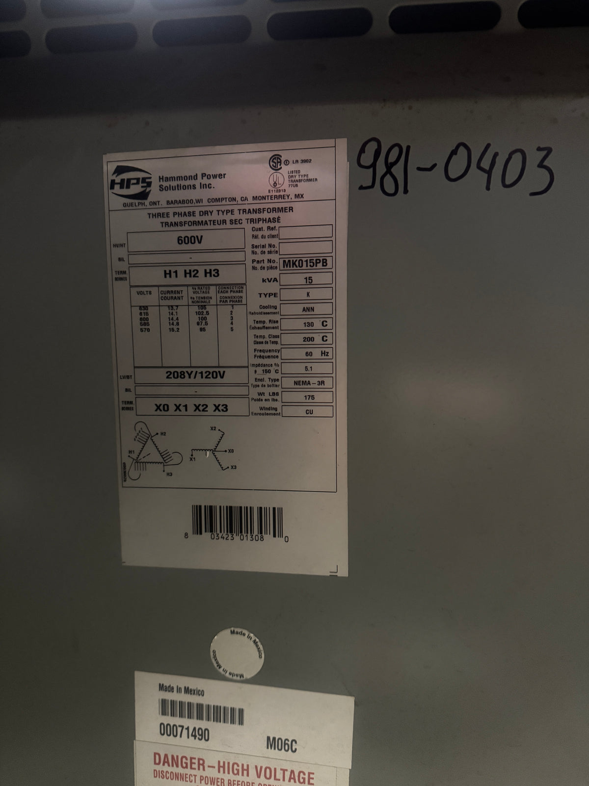 15 KVA 600 to 208/120V Isolation Multi-tap