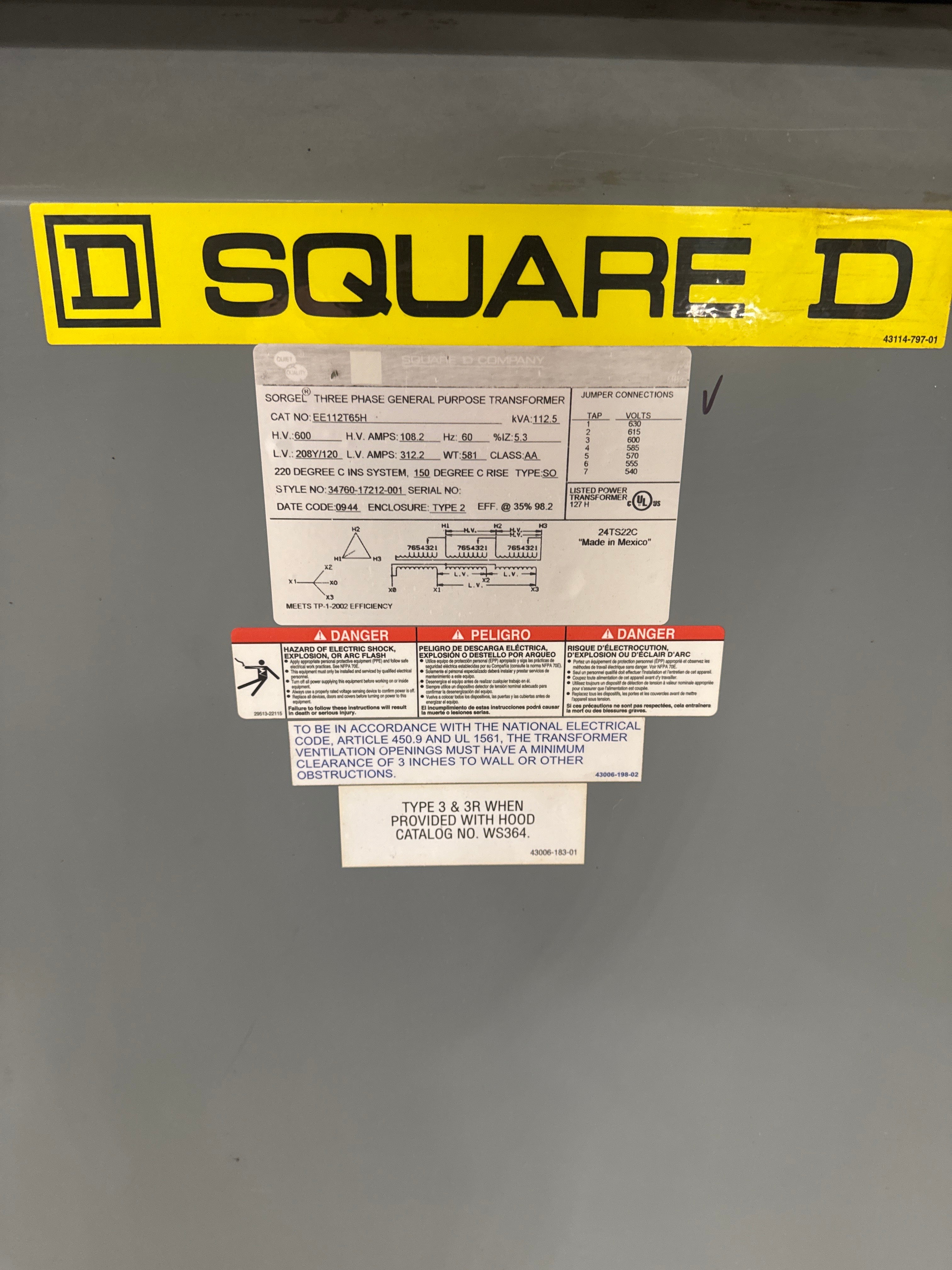 112.5 KVA 600v to 208/120v Isolation Transformer