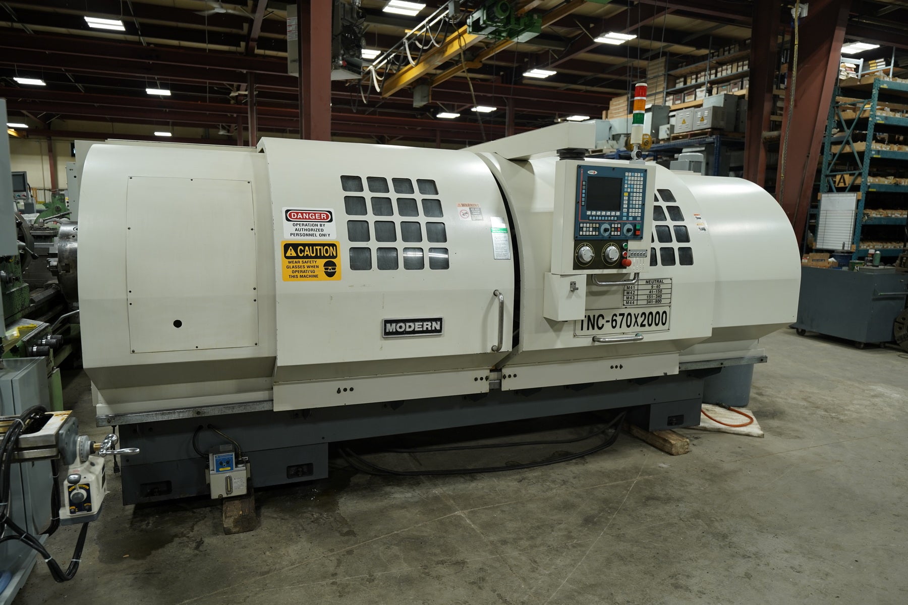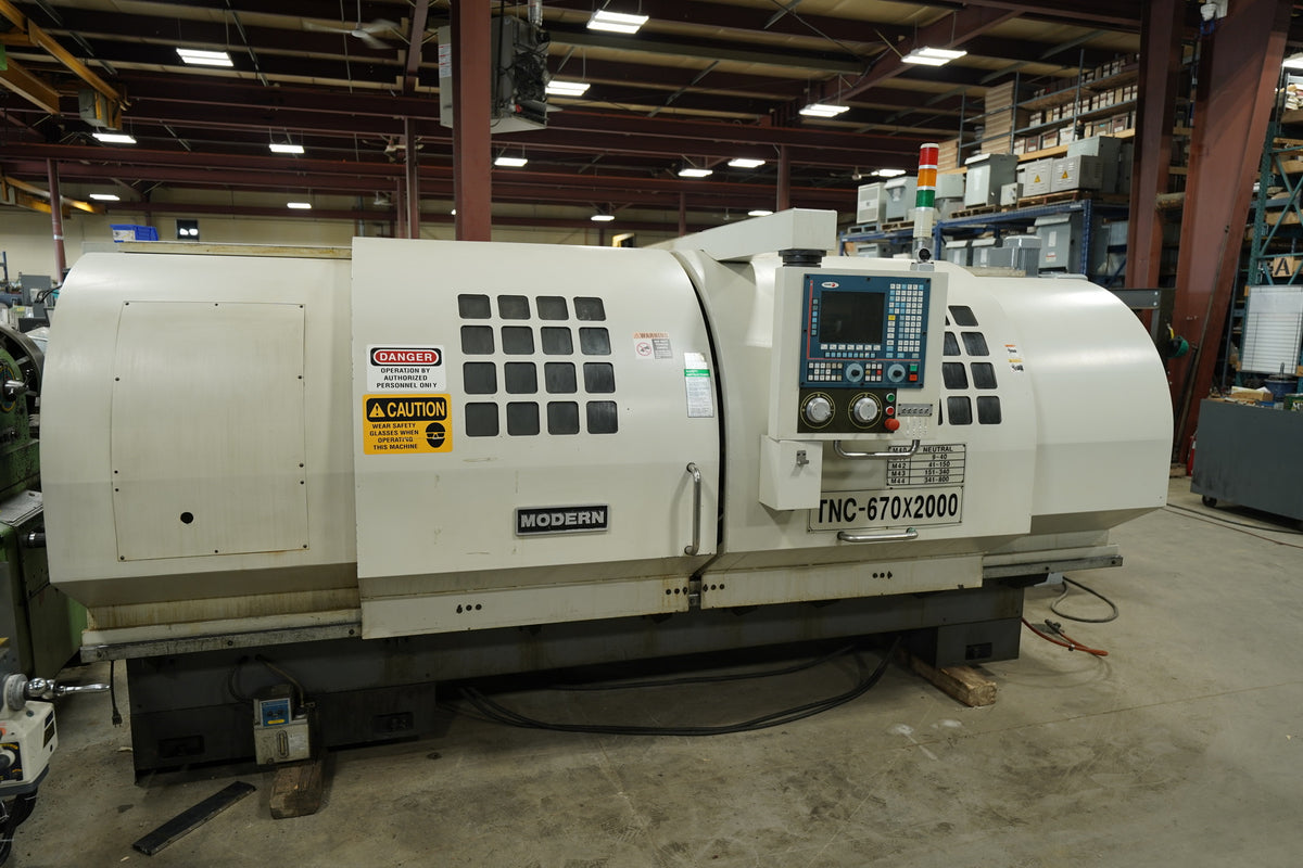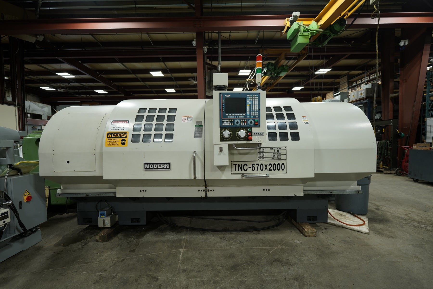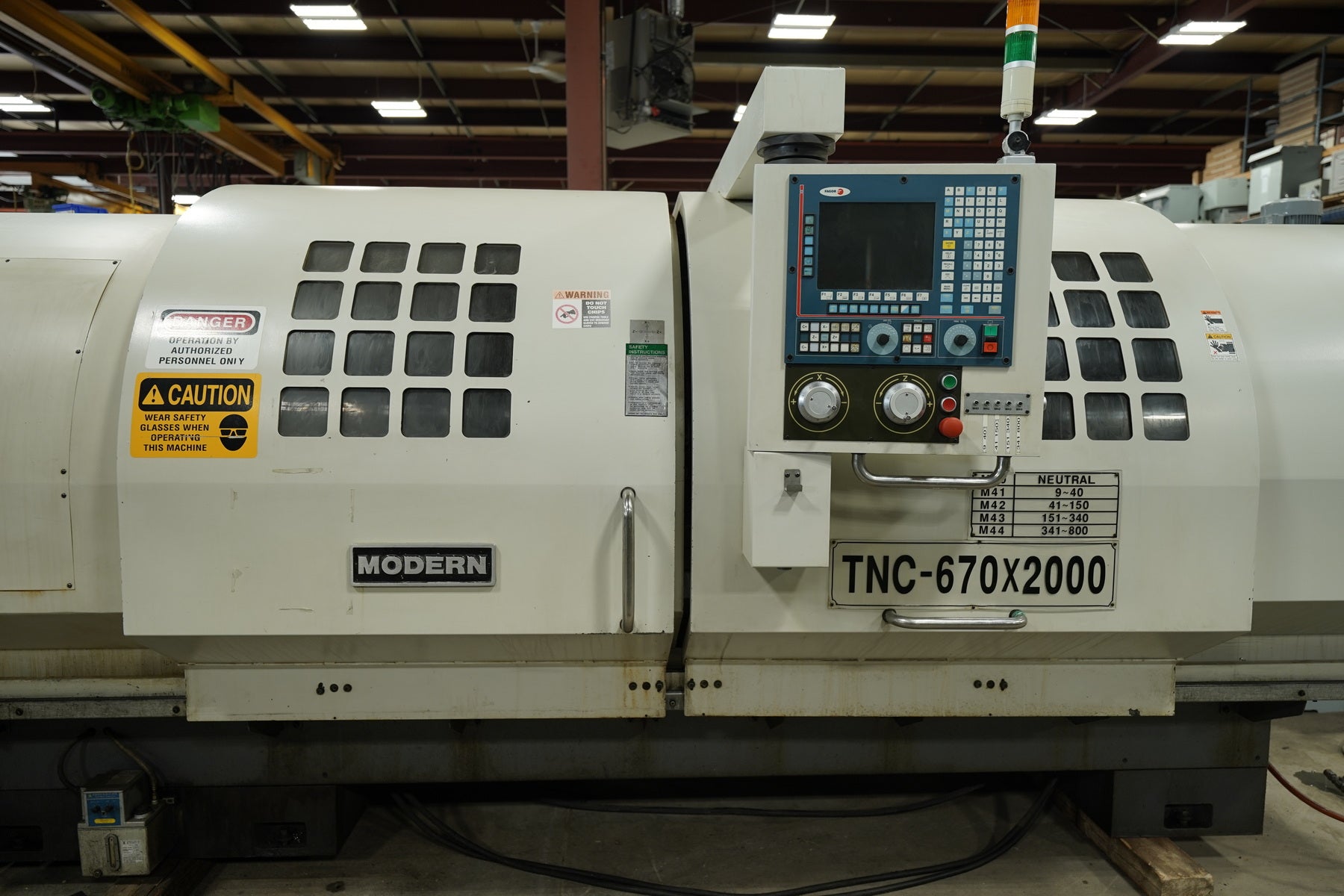 The Modern TNC 670 x 2000 CNC Lathe delivers powerful performance with a 26" swing, 80" between centers, and a large 6.25" spindle bore. Controlled via Fagor 8055 TC, this machine features a 31 HP spindle motor, chip conveyor, AC servo motors, and auto lubrication—ideal for heavy-duty turning applications.