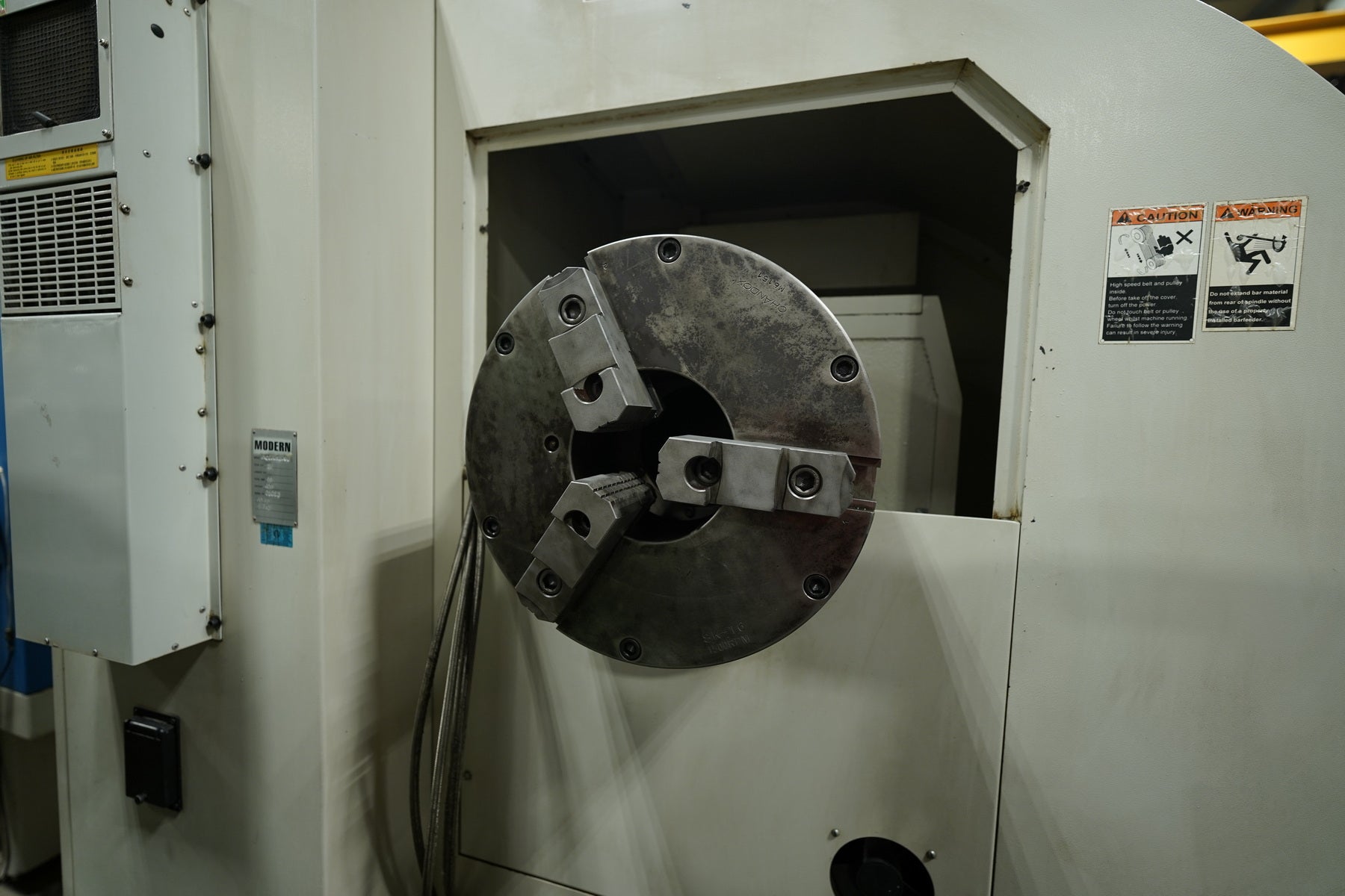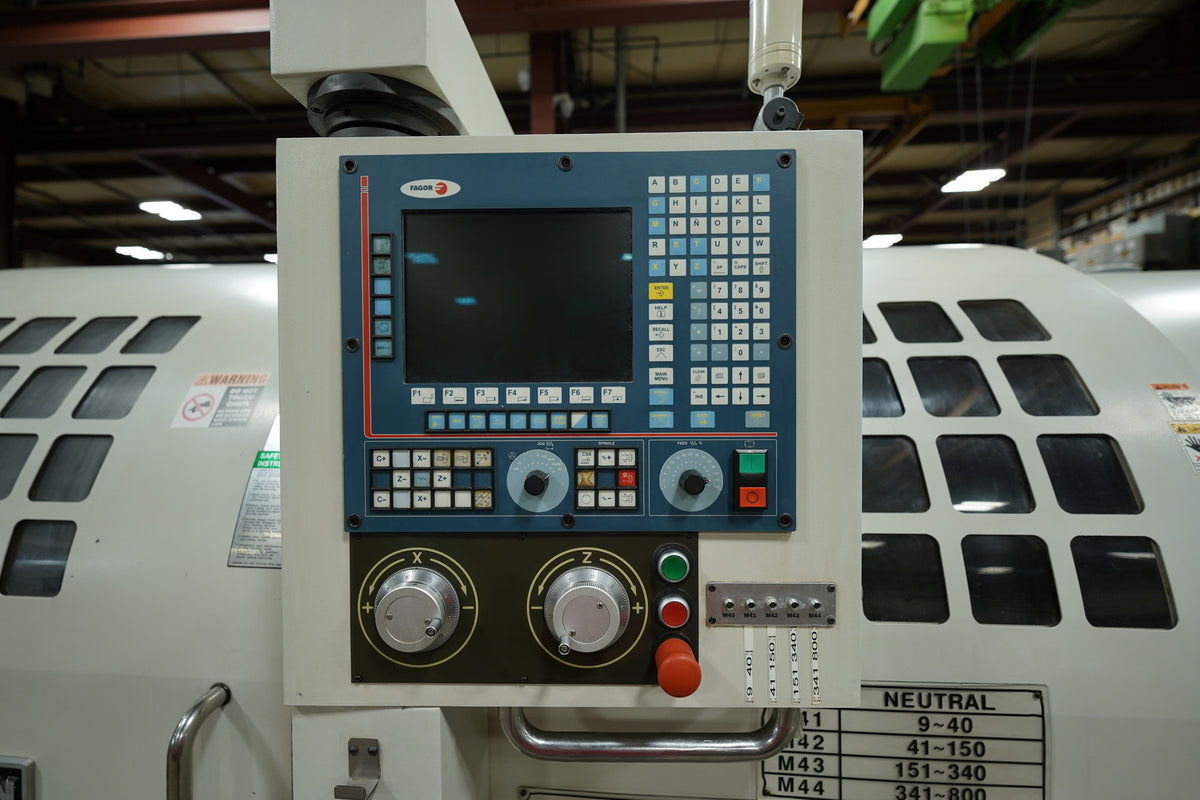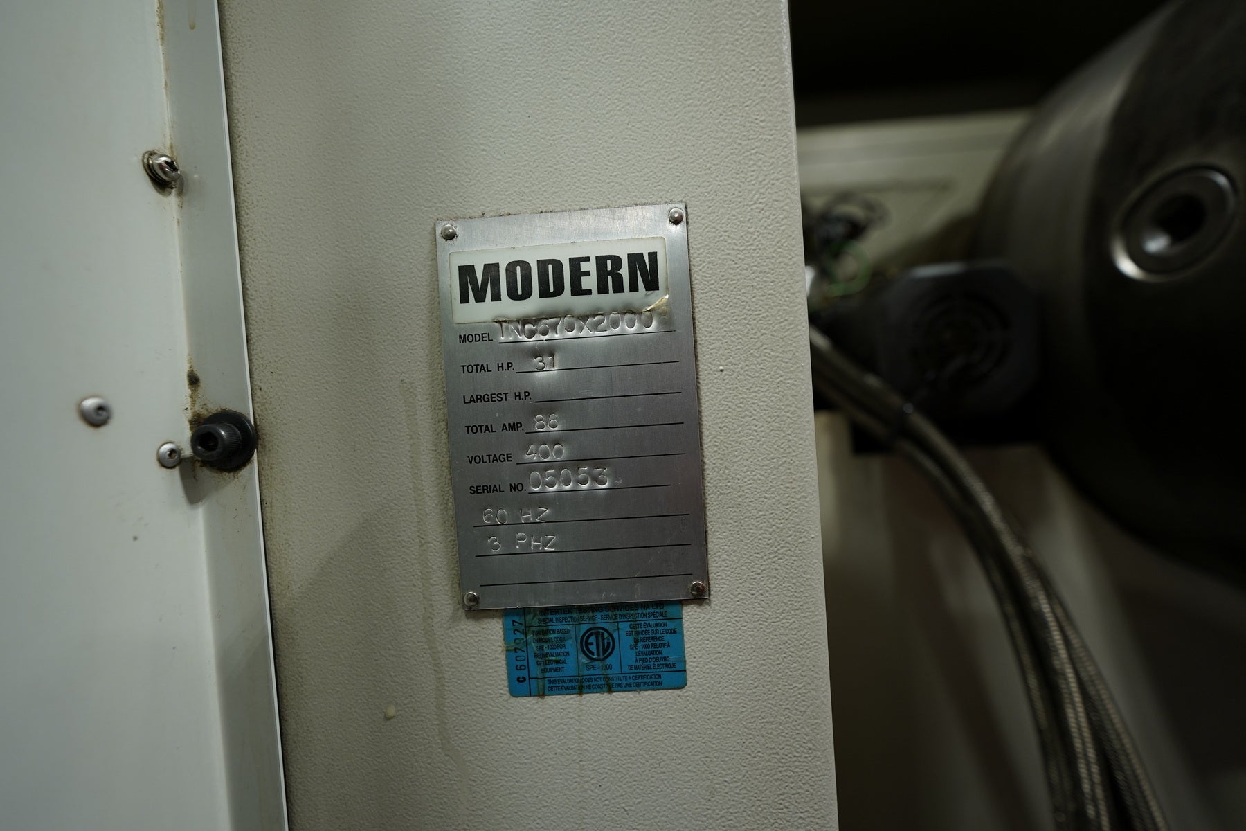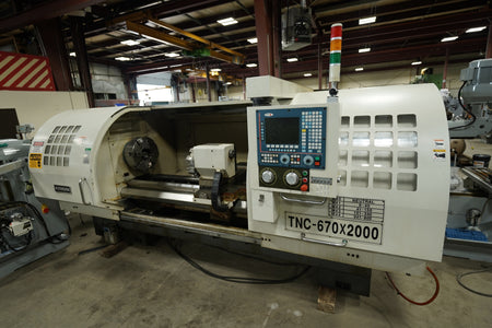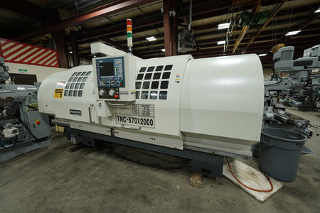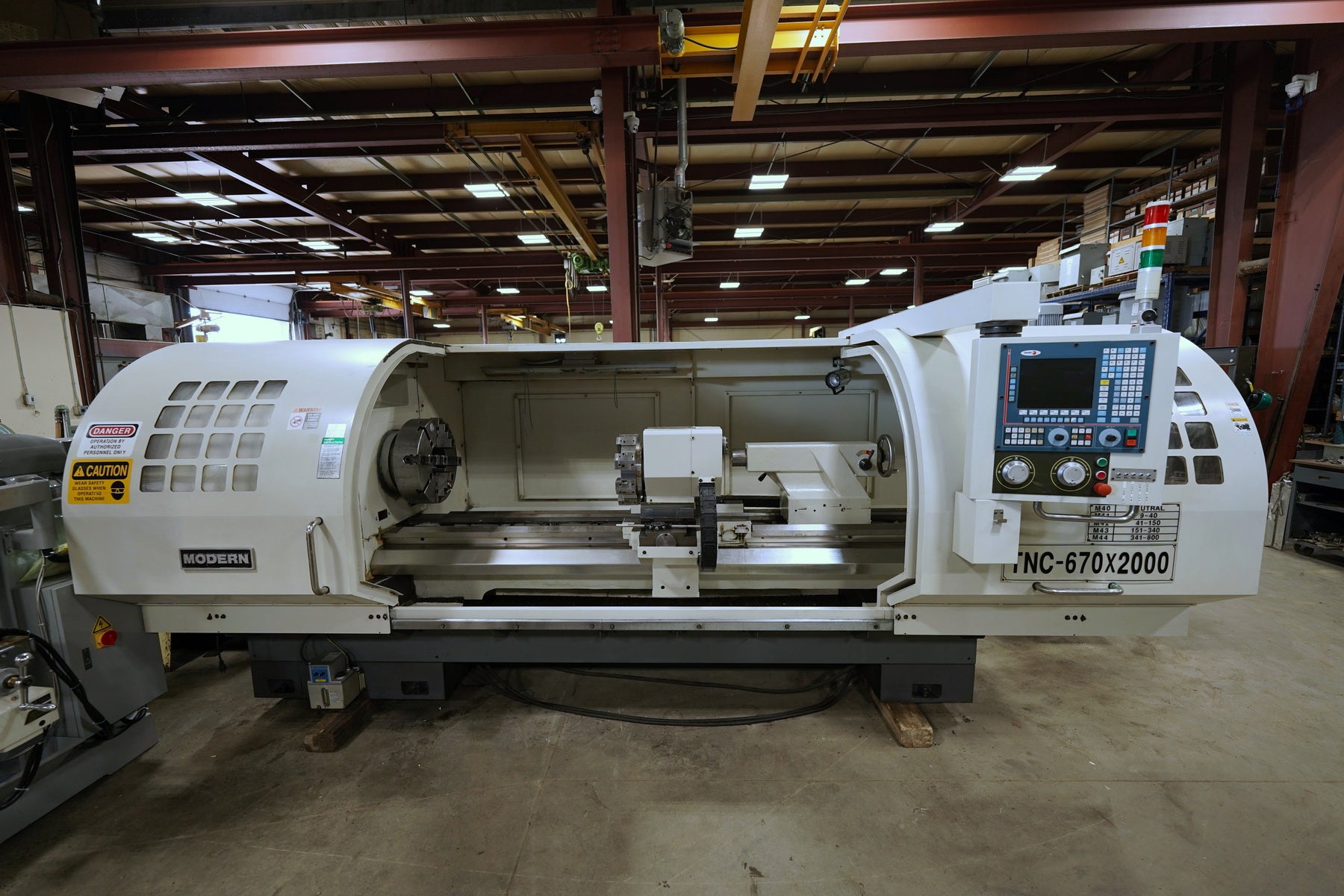 The Modern TNC 670 x 2000 CNC Lathe delivers powerful performance with a 26" swing, 80" between centers, and a large 6.25" spindle bore. Controlled via Fagor 8055 TC, this machine features a 31 HP spindle motor, chip conveyor, AC servo motors, and auto lubrication—ideal for heavy-duty turning applications.
