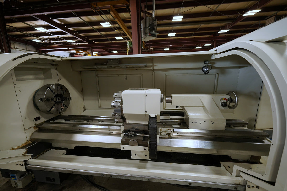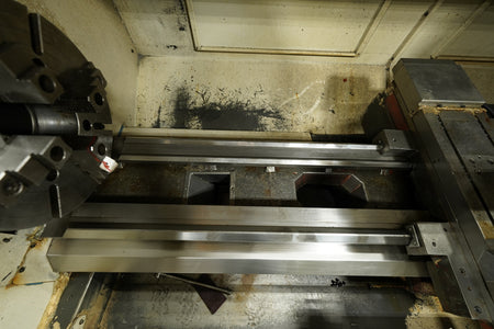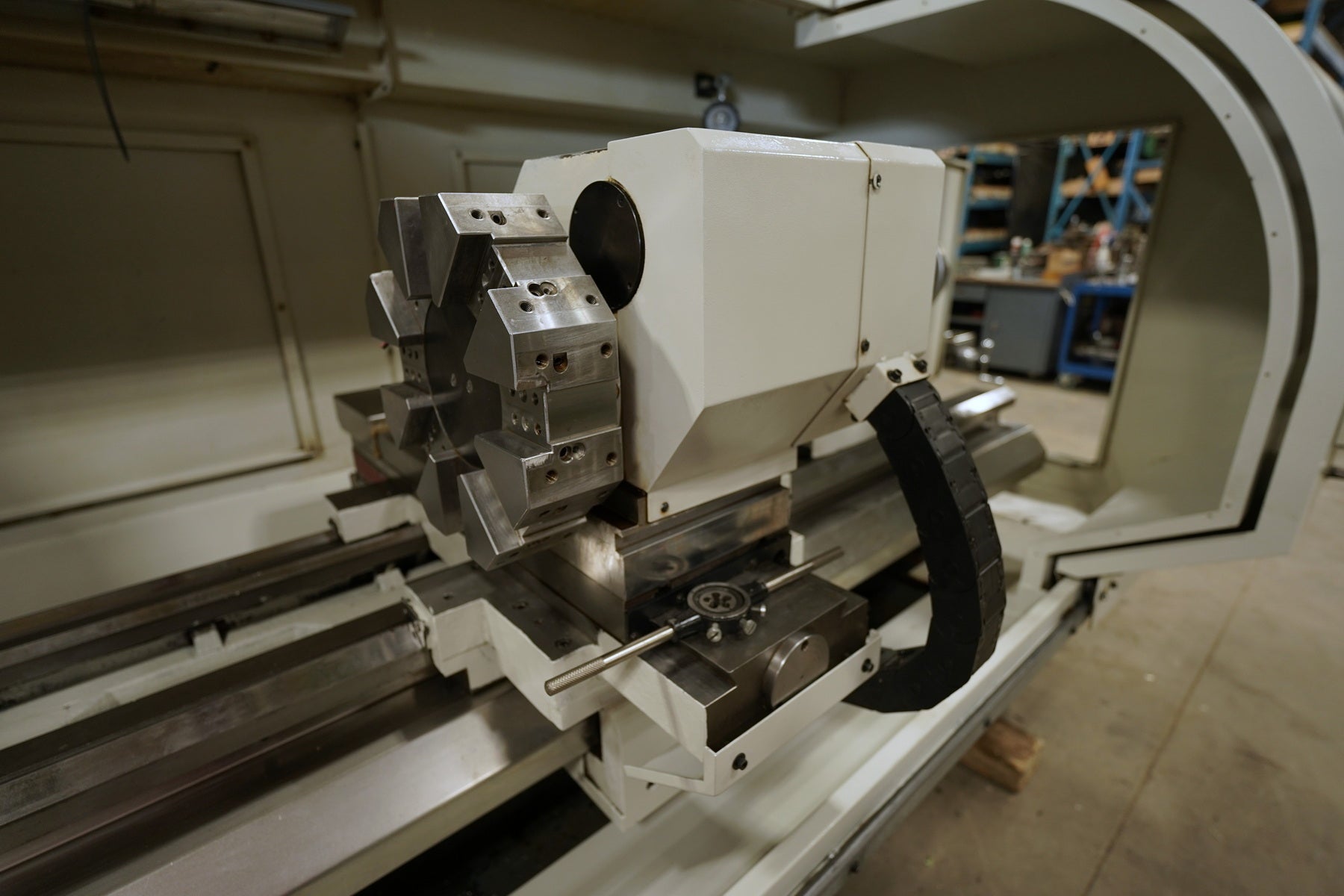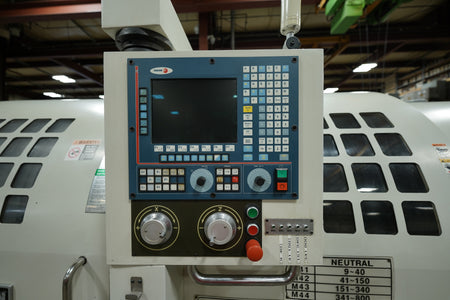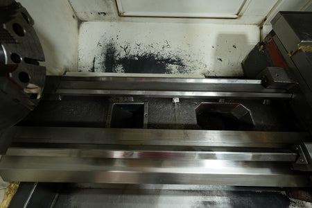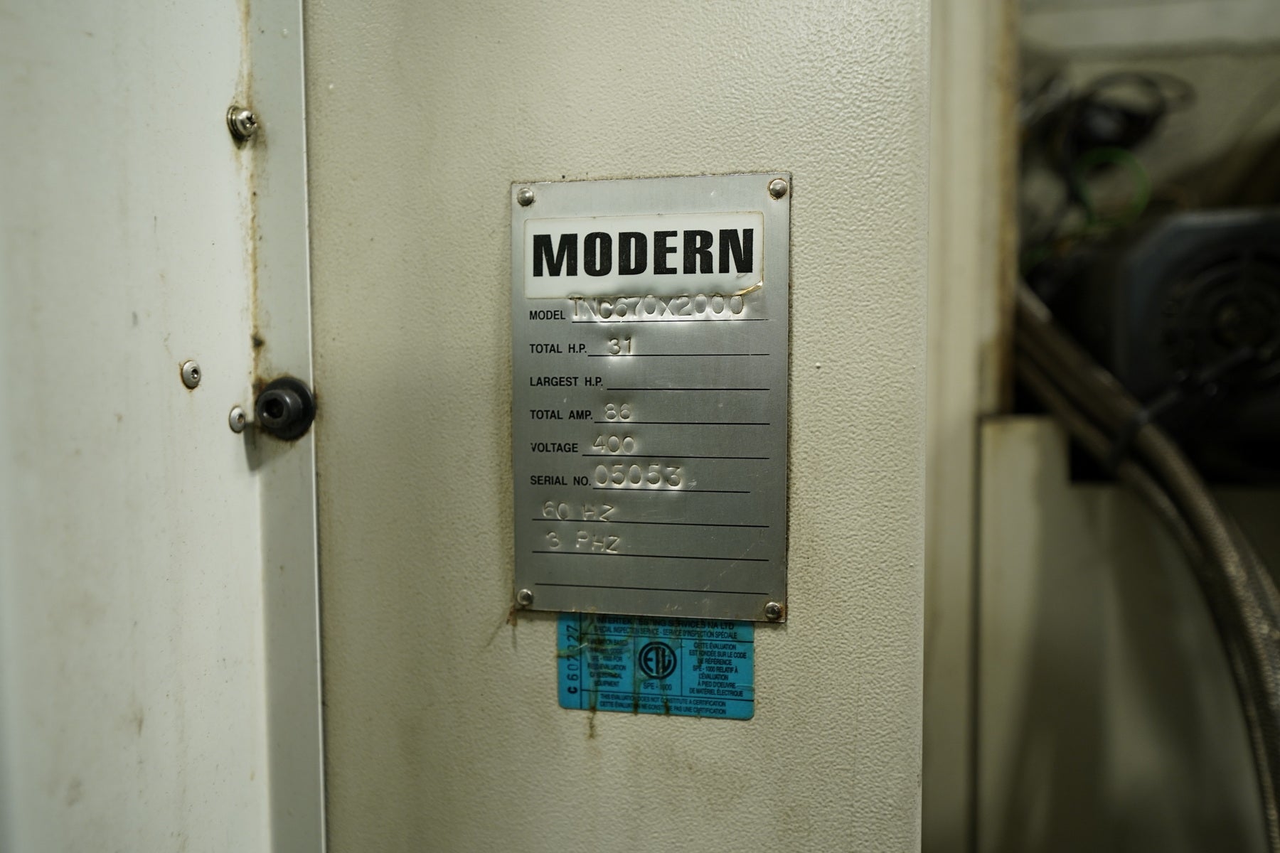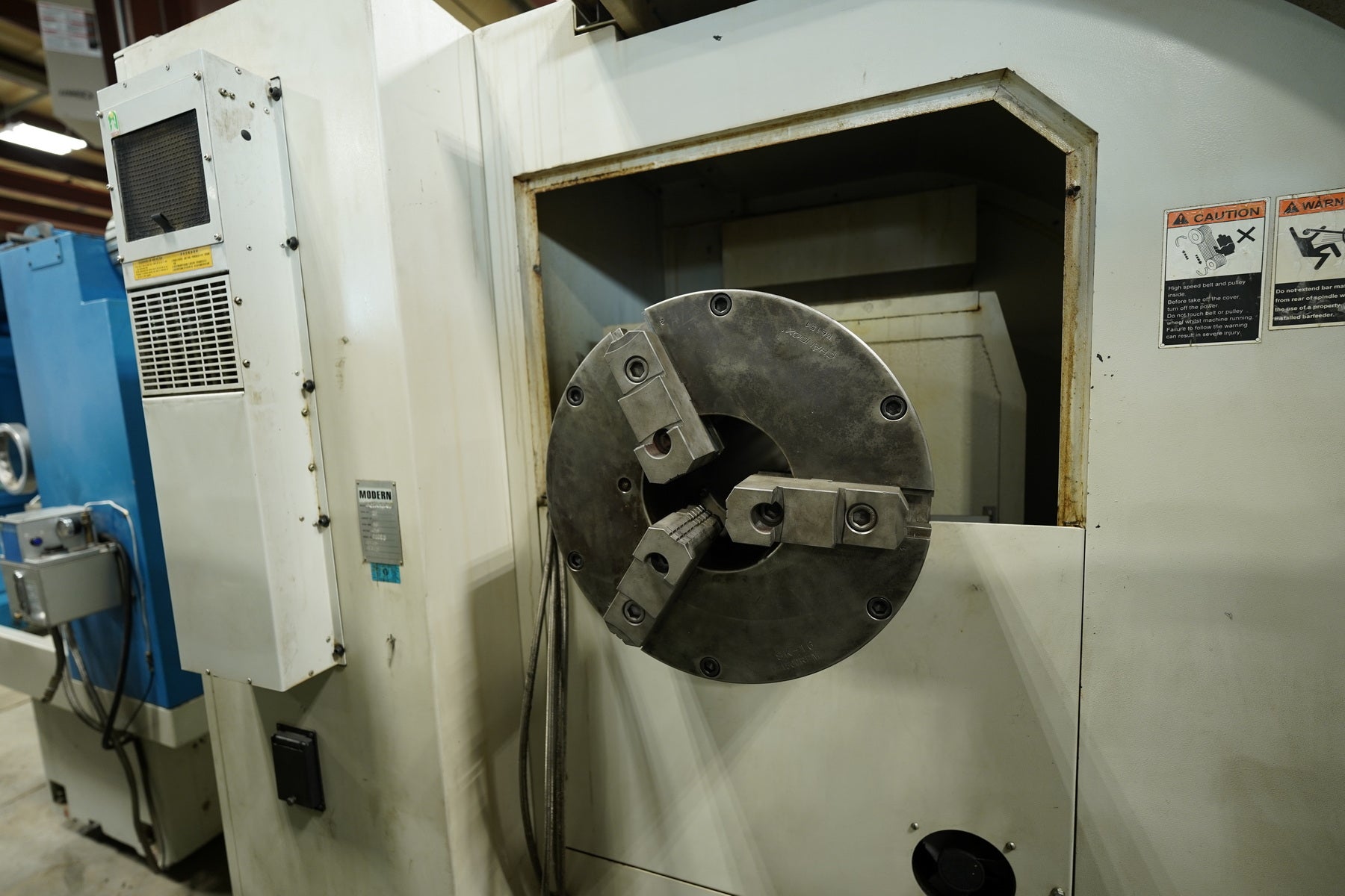 The Modern TNC 670 x 2000 CNC Lathe delivers powerful performance with a 26" swing, 80" between centers, and a large 6.25" spindle bore. Controlled via Fagor 8055 TC, this machine features a 31 HP spindle motor, chip conveyor, AC servo motors, and auto lubrication—ideal for heavy-duty turning applications.