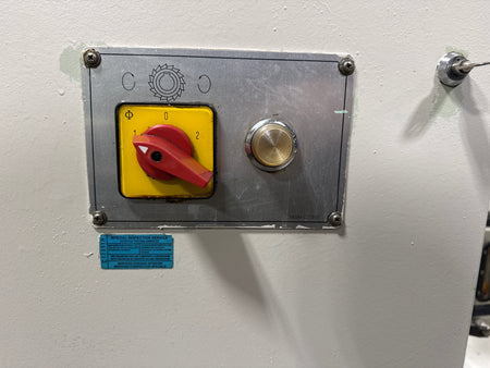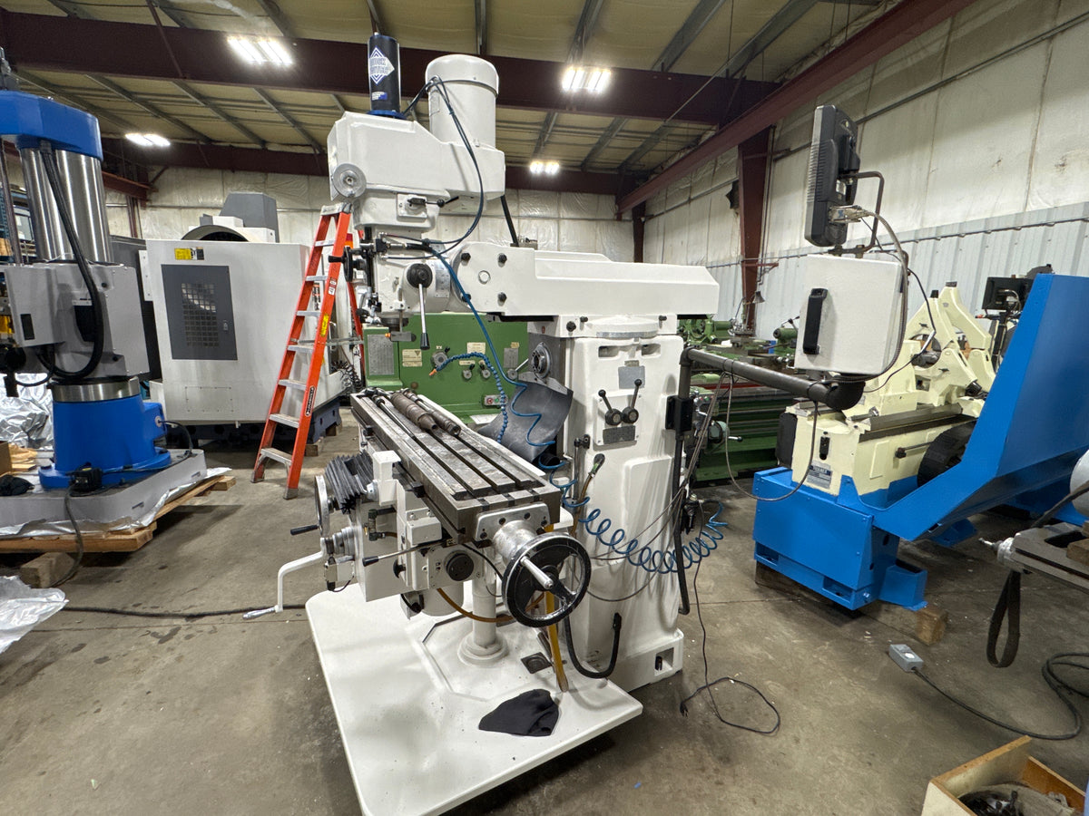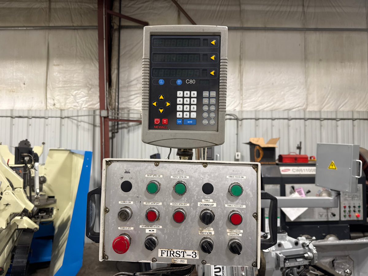 FIRST LC-20VHS is a heavy universal vertical/horizontal turret milling machine equipped with NT40 tapers on both spindles, giving solid rigidity for cutter arbors and tooling. A variable-speed vertical head with low and high ranges from 60 up to 4500 rpm covers everything from heavy roughing to fine drilling and finishing. The machine is fitted with a Newall C80 three-axis DRO for accurate positioning on the knee and table. A geared feed gearbox on the knee with high/low selection and feed dial provides convenient powered feeds, while an auxiliary 1.5 HP three-phase induction motor drives the feed system. Horizontal spindle capability with overarm support allows arbor milling and heavy slab work in addition to standard vertical head operations. Integrated coolant and control panel with clearly labeled pushbuttons make the LC-20VHS a practical production or job-shop mill. This model is a popular choice in Canada for industrial machining thanks to its universal configuration and robust build.
